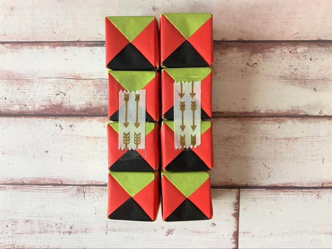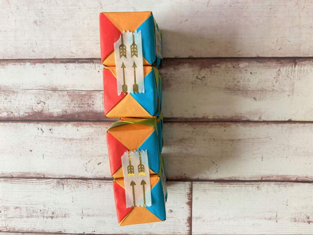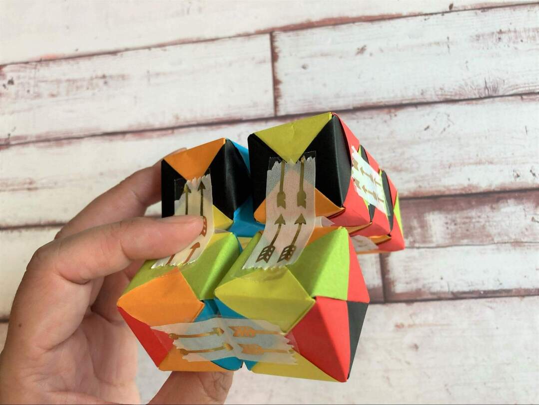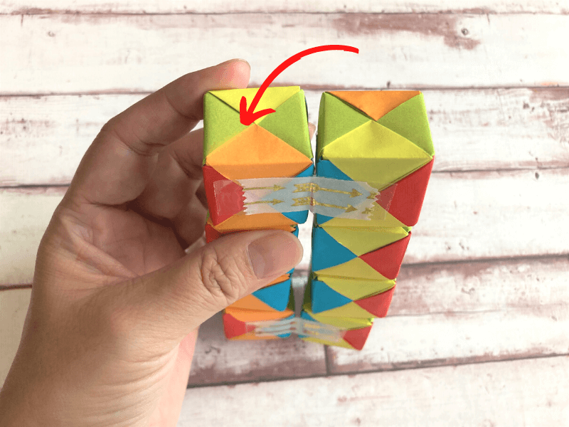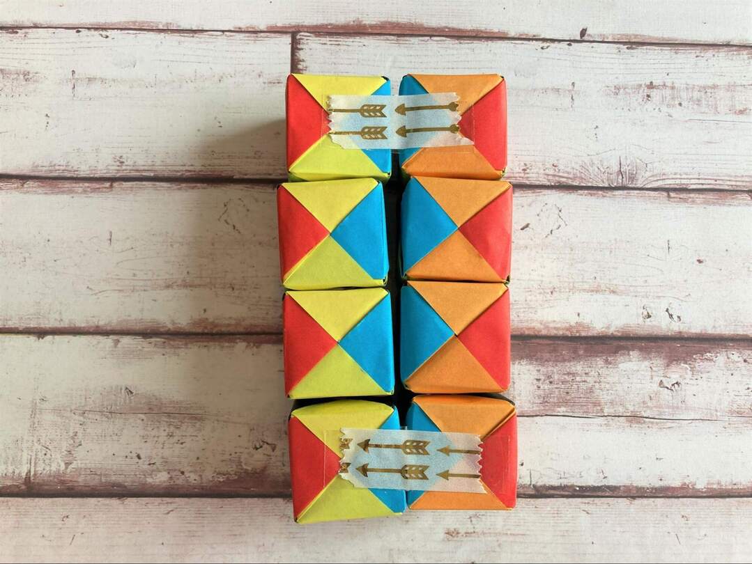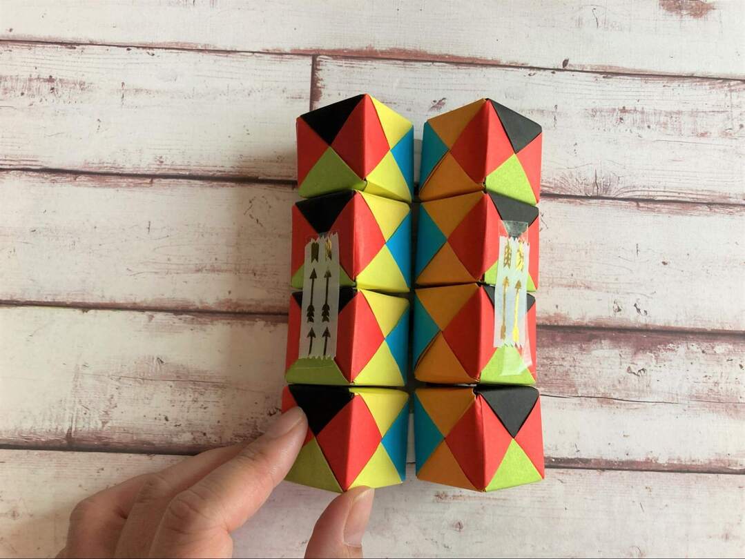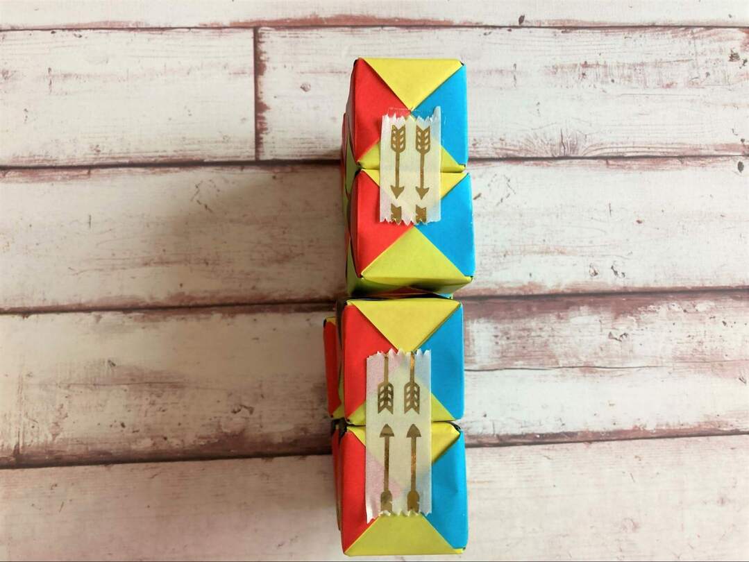 8個のキューブができたら、いよいよテープでつなげていきます!面の色を揃えたい場合には、ここで揃えて置くようにします。