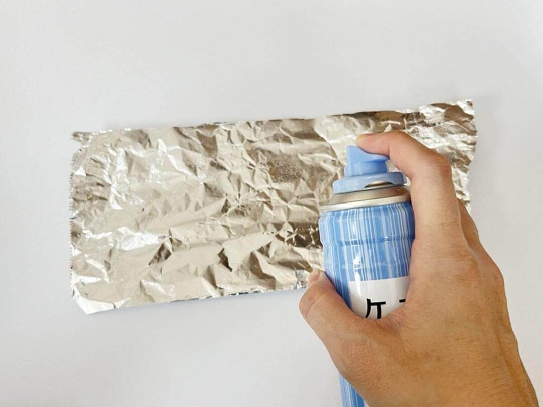 まずはアルミホイルを適当な長さでカットし、全体にまんべんなくヘアスプレーをかけます。かけすぎると仕上がりがベタッとしてしまうので注意!2往復くらいがちょうどいいですよ。