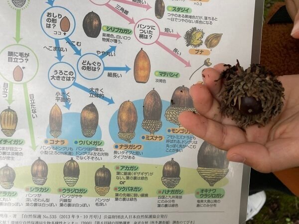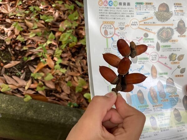 さっそく編集Oと小学生の子どもたちで、どんぐり検索表を持ってどんぐり拾いをしてみました♪