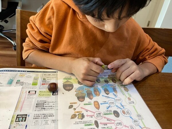 帰宅後もたくさん拾ってきたどんぐりを広げて、改めて『どんぐり検索表』で調べてみました。小学生になって、どんぐりを拾う機会もだいぶ減ってきましたが、気づけばすっかりどんぐり検索に夢中♡