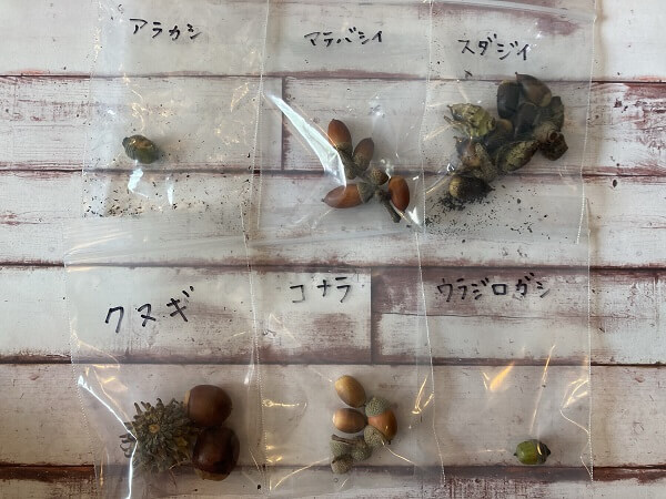 緑が多い地域に住んでいることもあってか、6種類のどんぐりを拾うことができました!同じような形でも、パンツや頭の形で違う木の種類ということもわかり、大人もとっても勉強になりましたよ。