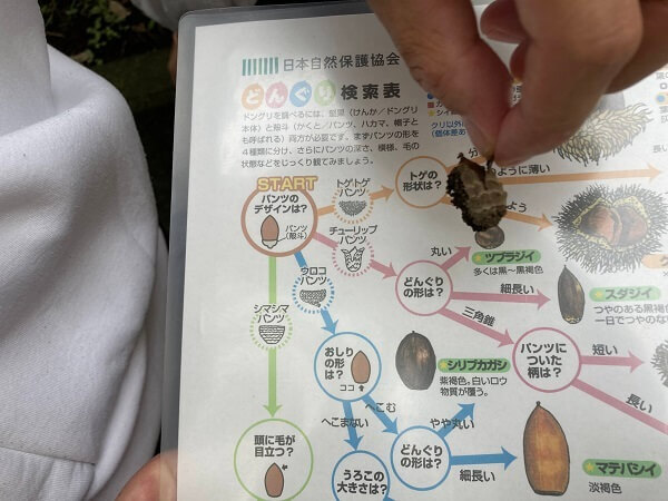 『どんぐり検索表』を使うと、さまざまなヒントから答えにたどりつくのでまるで「どんぐり探偵」のように遊べます。子どもだけでなく大人も十分に楽しめるので、秋の自然探索にぜひ『どんぐり検索表』を持参してみてくださいね!とってもおすすめです!