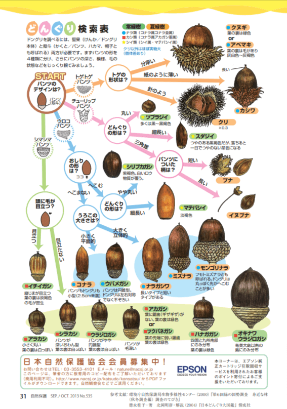 どんぐりはブナ科の木になる実の俗称。大小さまざまな種類がありますが、どんぐりの種類を一覧で紹介してくれる表があるんです! それが、日本自然保護協会が公表している『どんぐり検索表』です。