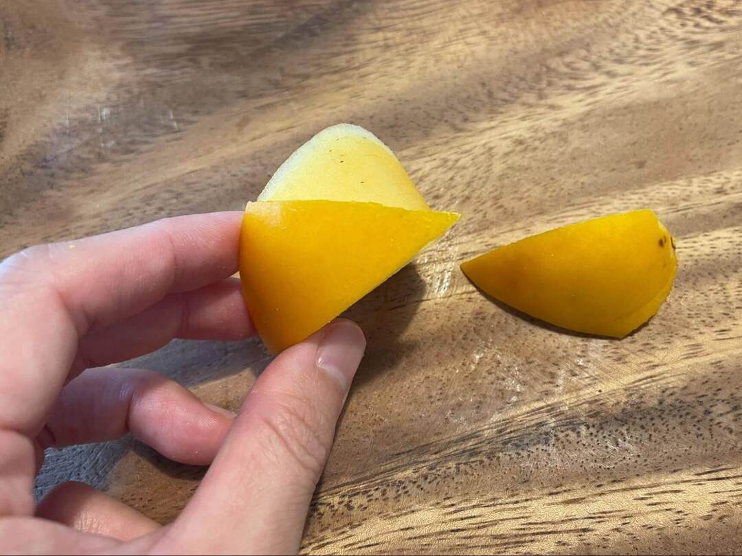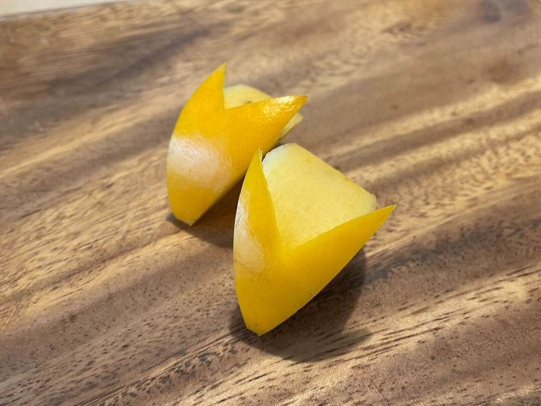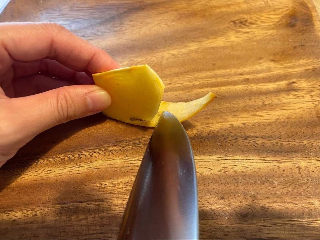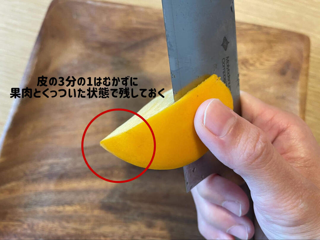 つづいて皮をむいていきます。先端部分には刃をいれず、皮と果肉がくっついた状態で残しておきましょう。