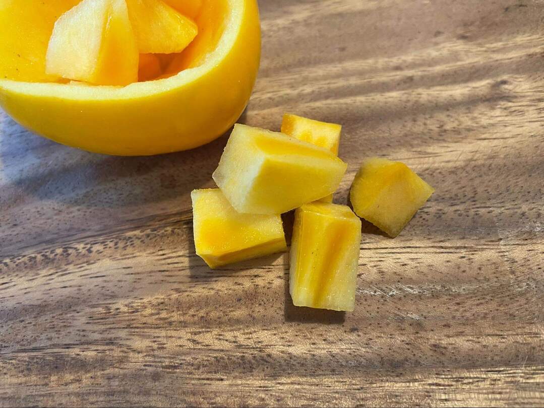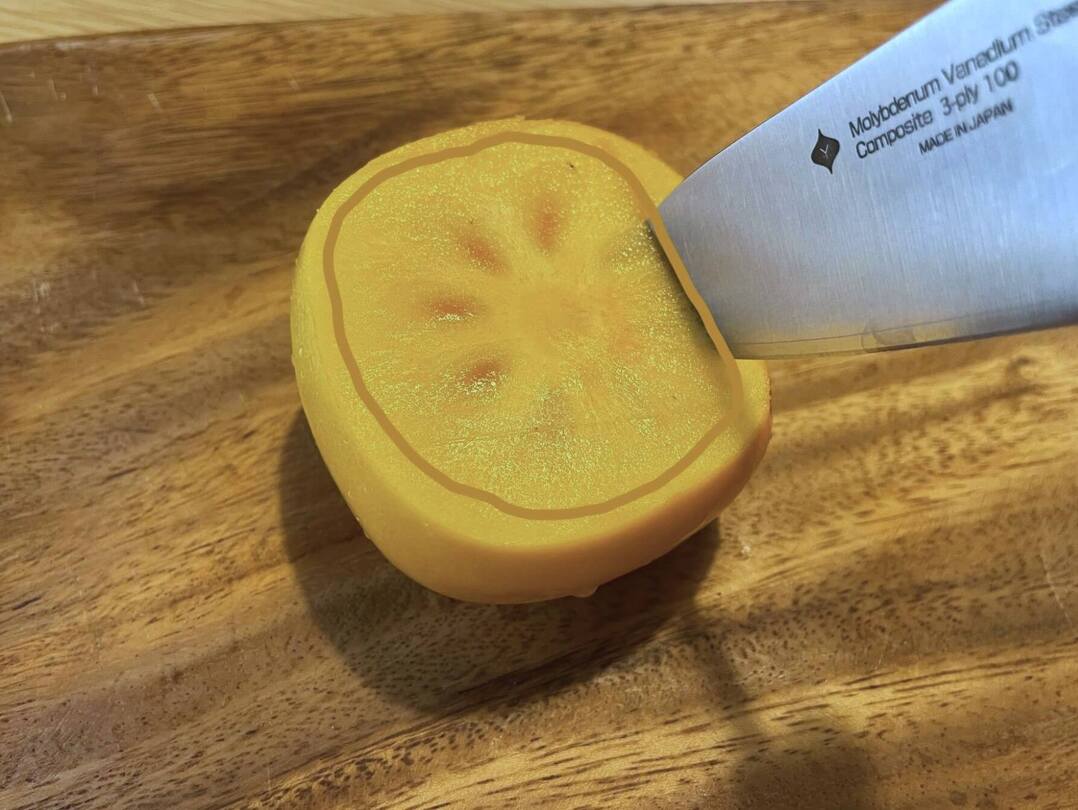 つぎに柿の果肉部分をくり抜いて取り出しましょう。手を切らないよう、ゆっくりと行ってください。
