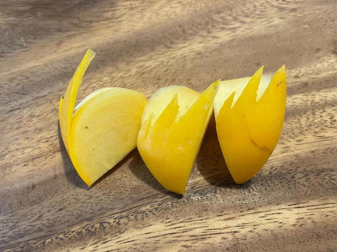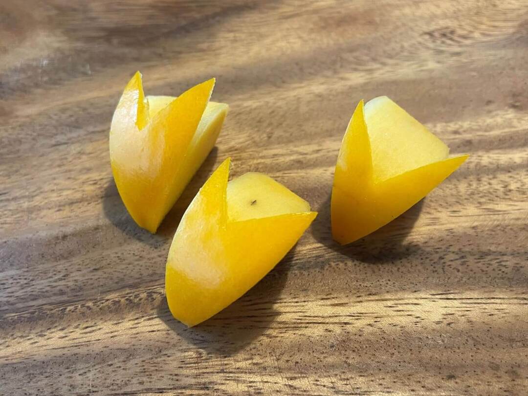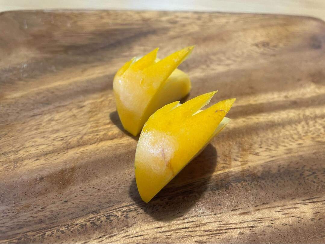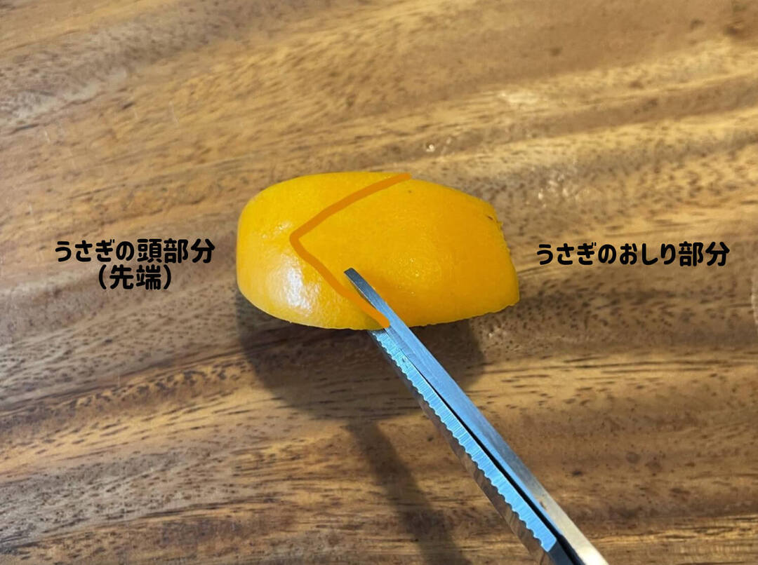 「うさぎ」の切り方同様先端部分には刃をいれず、皮と果肉がくっついた状態で残しておきましょう。