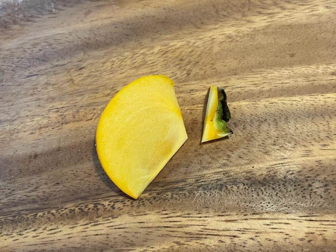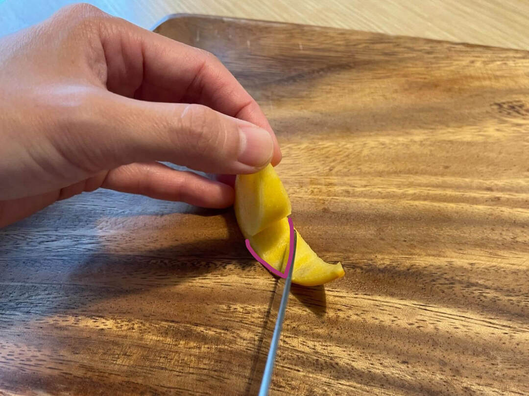 残る皮部分ができるだけ鋭角になるよう、皮をななめにカットします。