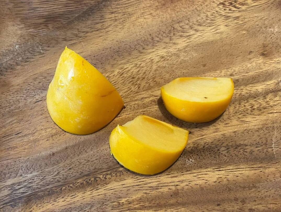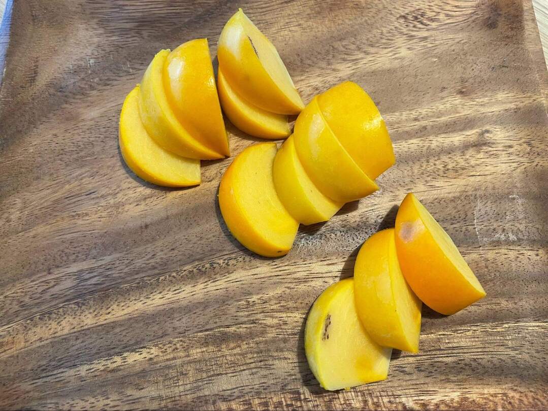 柿を12等分に切ります。まず4等分し、それぞれを3等分していくと均等にできますよ。