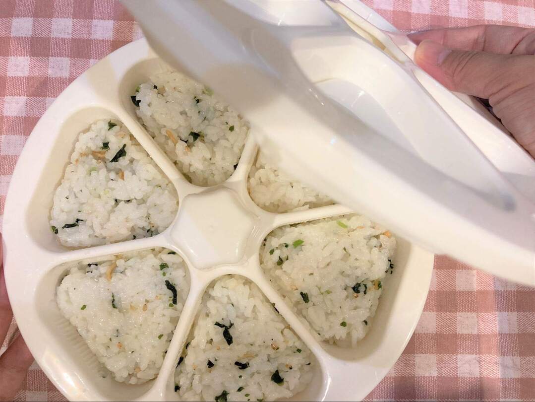 ご飯を詰め終わったらフタをして、上からギュッと押すだけ!全体をギュッと押したあと、念のためおにぎり1個1個のスペースもしっかり押さえます。