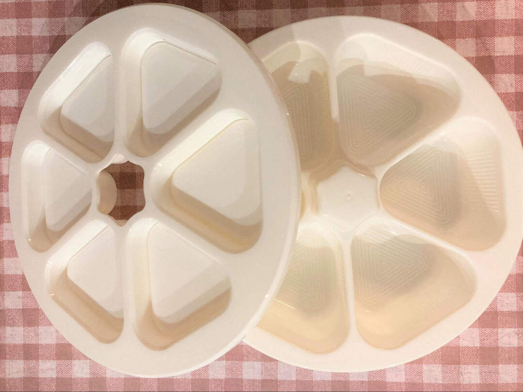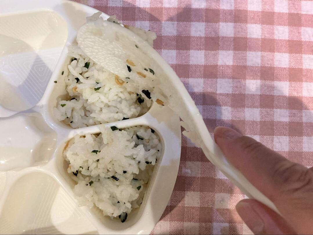 出すときに本体やフタにご飯がくっついてしまうのでは?と心配したのですが、どちらも表面にくっつき防止の模様がついていることもあり、スルッとおにぎりを出せました!