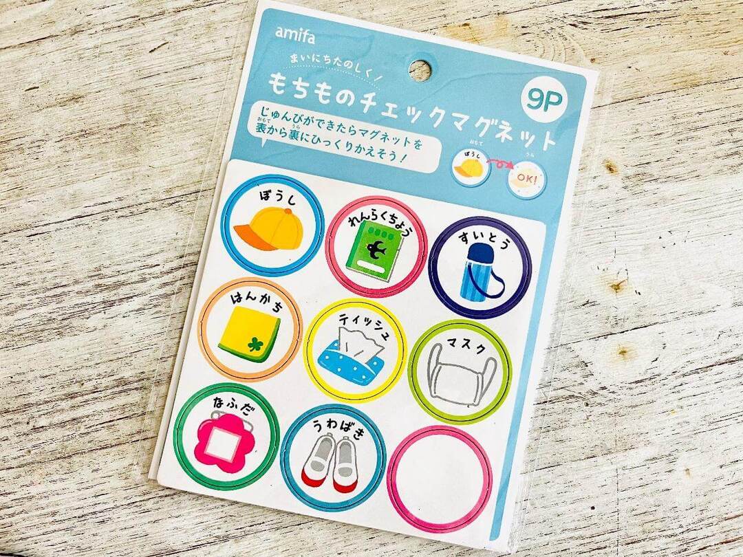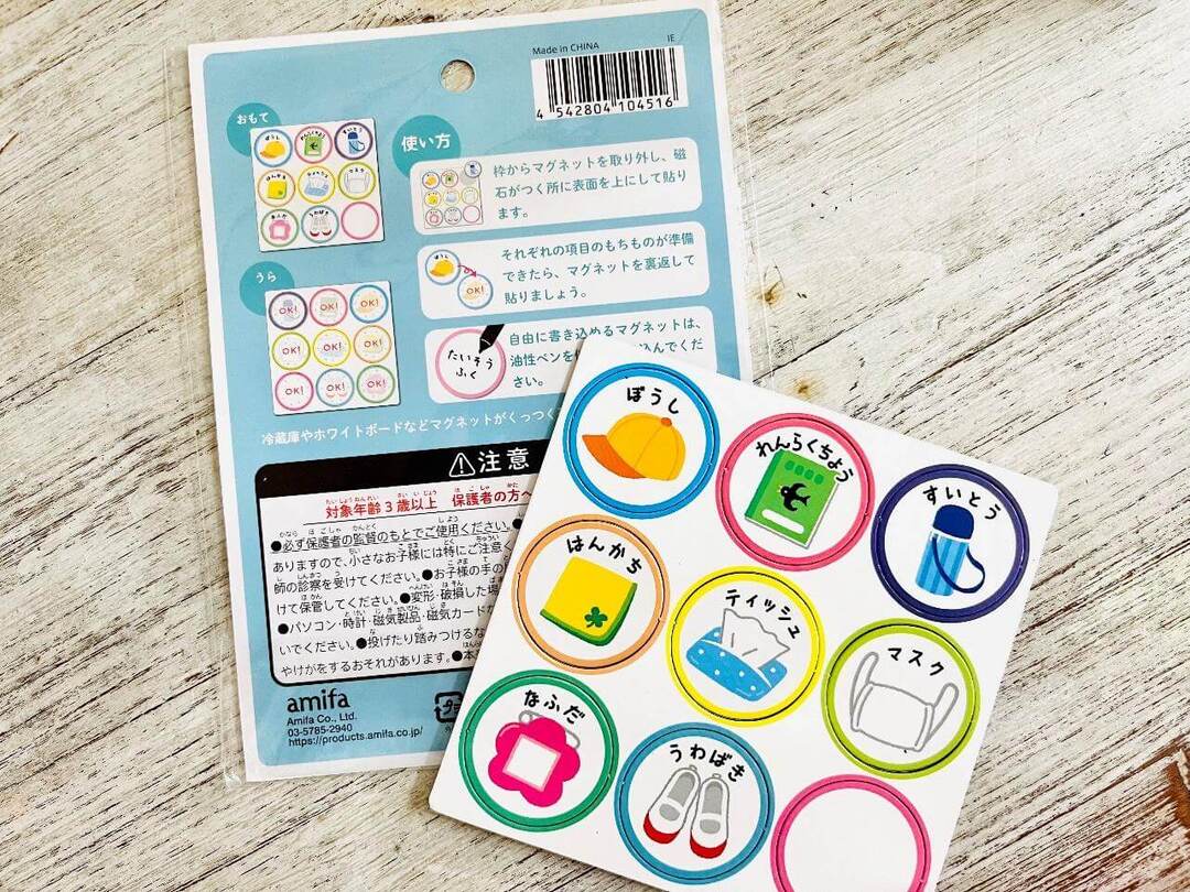 園や小学校に持っていく帽子や連絡帳、水筒など、8種類のアイテムが描かれたマグネットと、白紙のマグネットの全9個ピースがセットになっています。