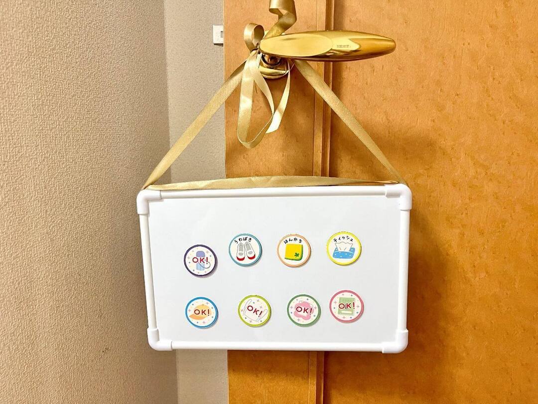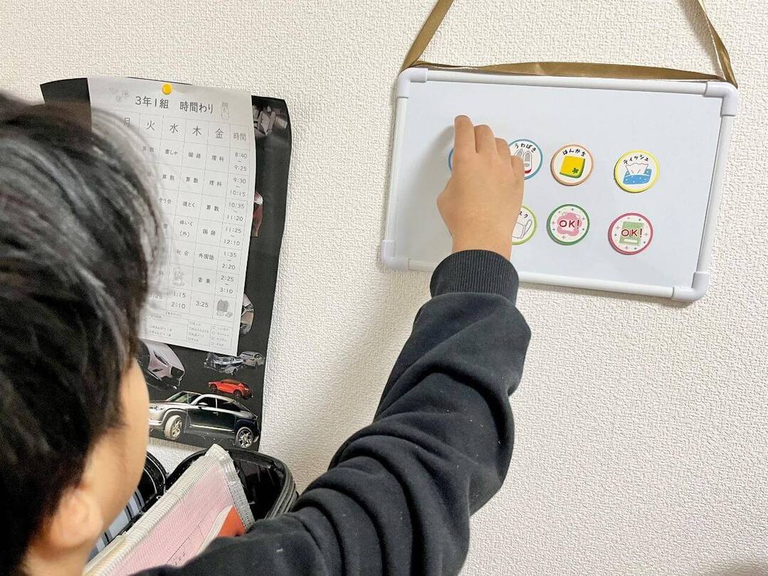 わが家では吊り下げタイプのホワイトボードを用意し、いつも翌日の用意をする場所にもちものチェックマグネットを設置してみました。子どもの背でも届く場所に設置するのがコツです。