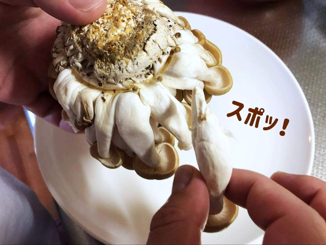 ぶなしめじをひっくり返し、指で軸の中央部分をもって端から順にやさしく引き抜くだけ!下向きにひねるようにして引っ張るときれいに「スポッ!」と抜けますよ。