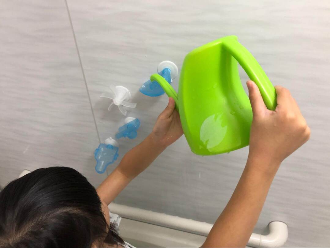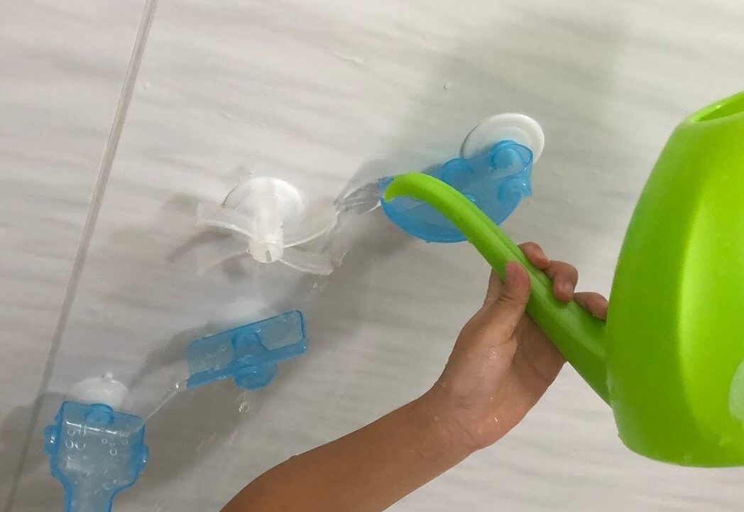 遊びながら学べる「ピタッとながれ~る(水車セット)」。子どもの好奇心をくすぐるしかけが満載で、お風呂への誘導にもぴったりですよ♪