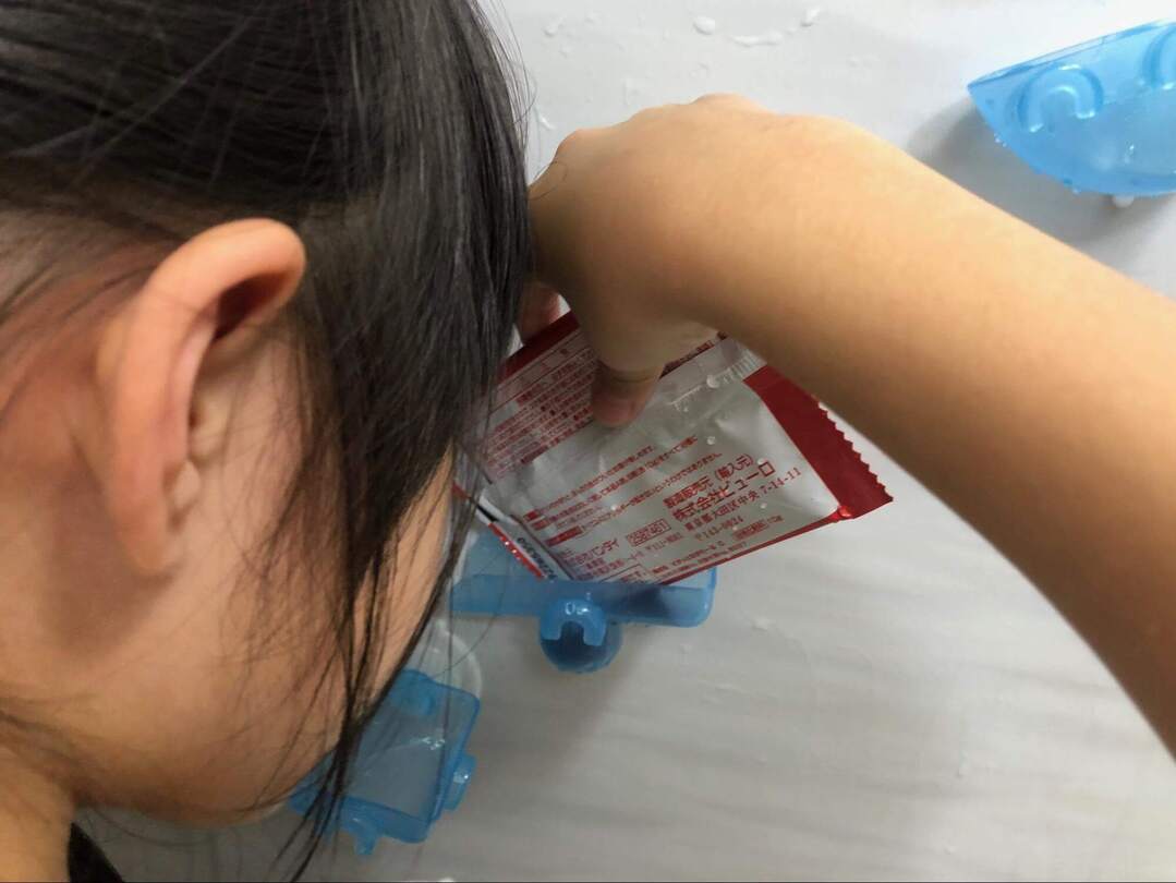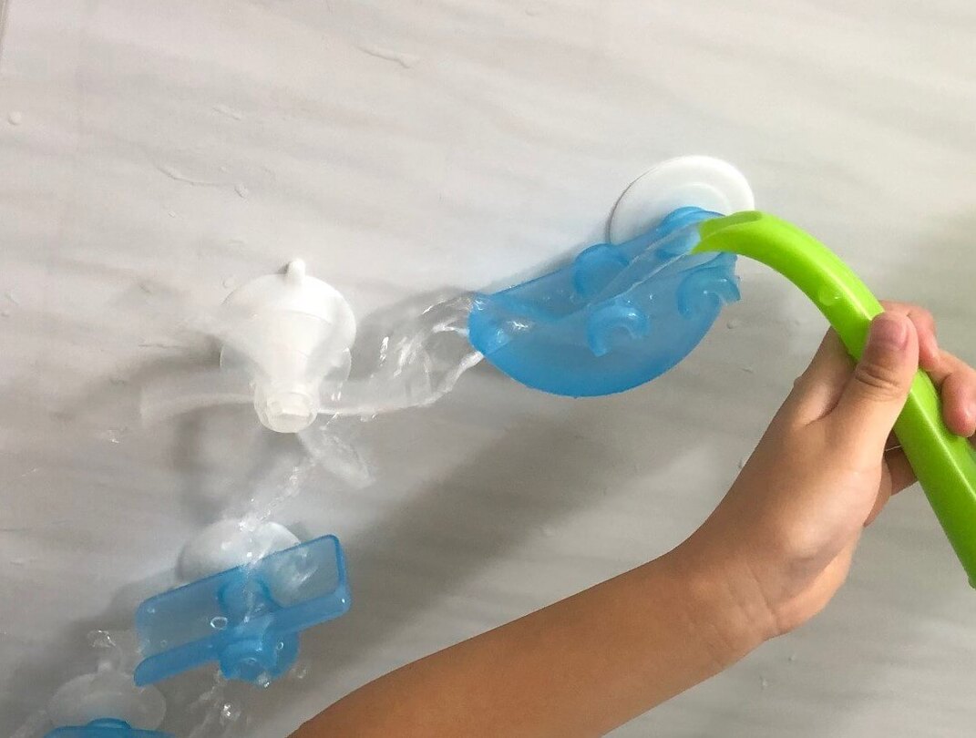 お湯の色の変化を楽しめるだけでなく、パッケージ写真のようにお風呂の壁にパーツを貼りつけて水が通るオリジナルのコースを作ることができます。吸盤つきでコースのアレンジは自由自在、パーツはプラスチック素材なので何度でも繰り返し遊べるのがうれしいポイントです。