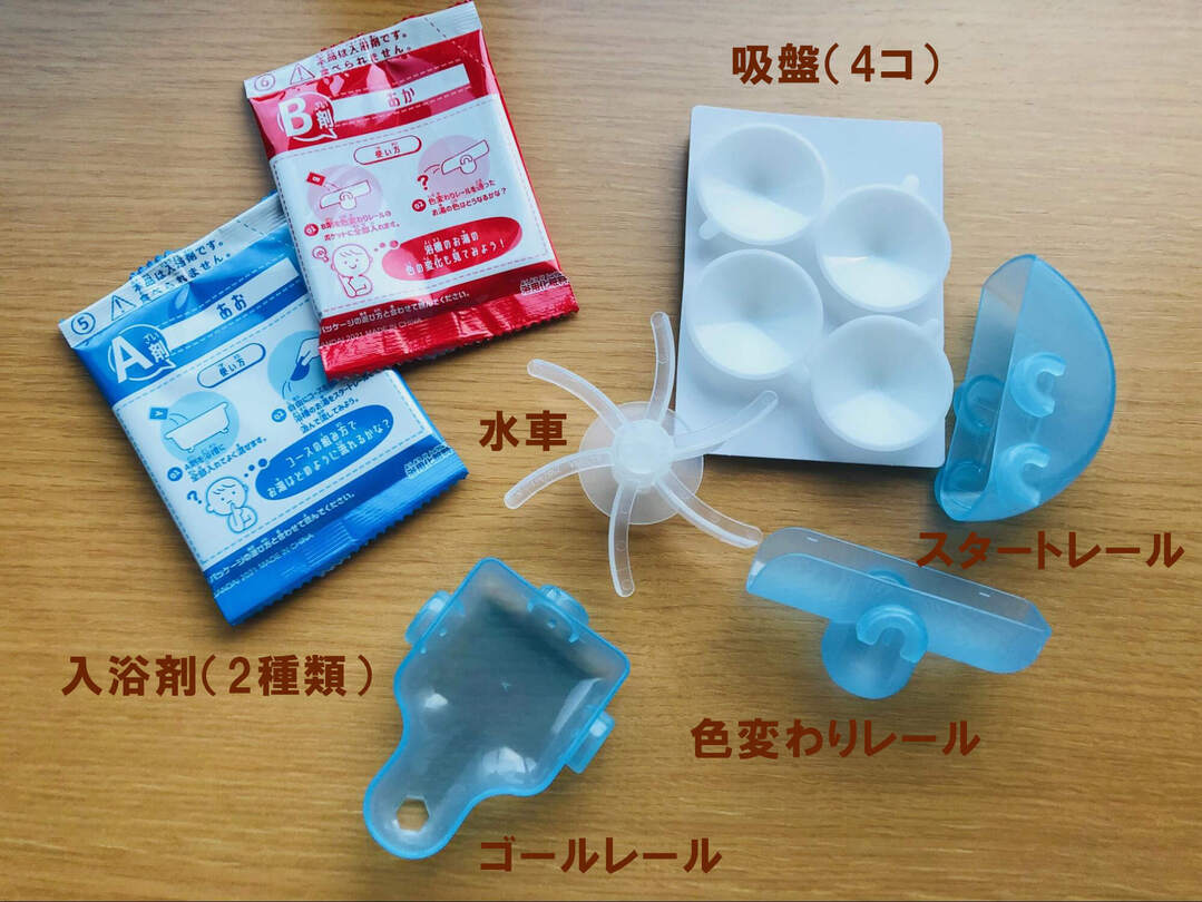 水車パーツのほかに、スタートレール、色変わりレール、ゴールレール、さらに吸盤が4つ、青色(A剤)&赤色(B剤)の入浴剤が1袋ずつ入っています。