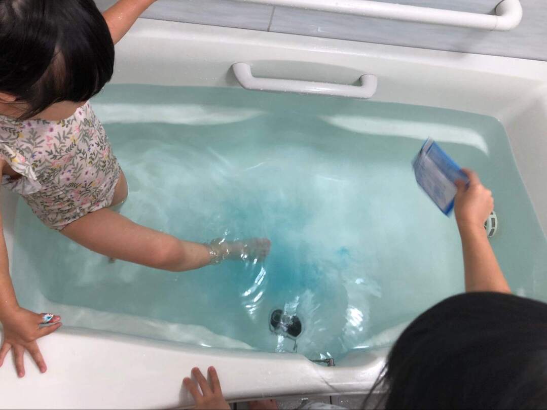 レールに水を流す前に、湯船に青色の入浴剤をいれます。「青くなった~!!」とすでに大盛り上がり。