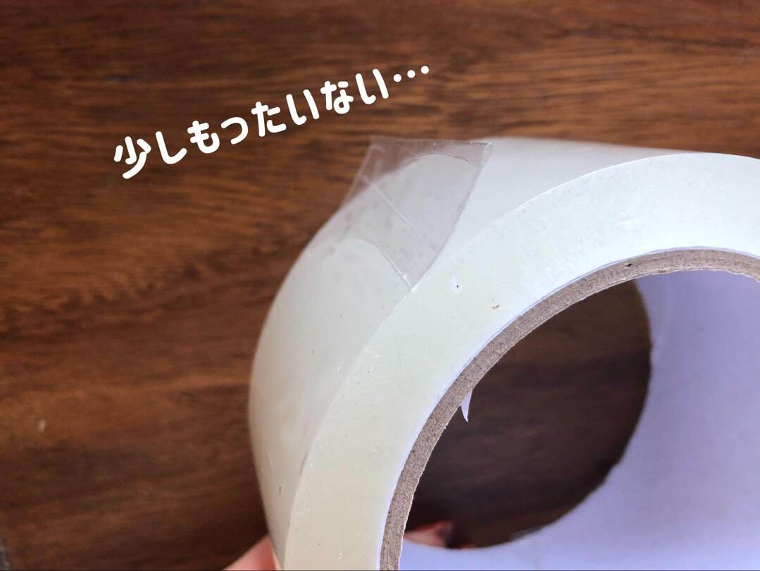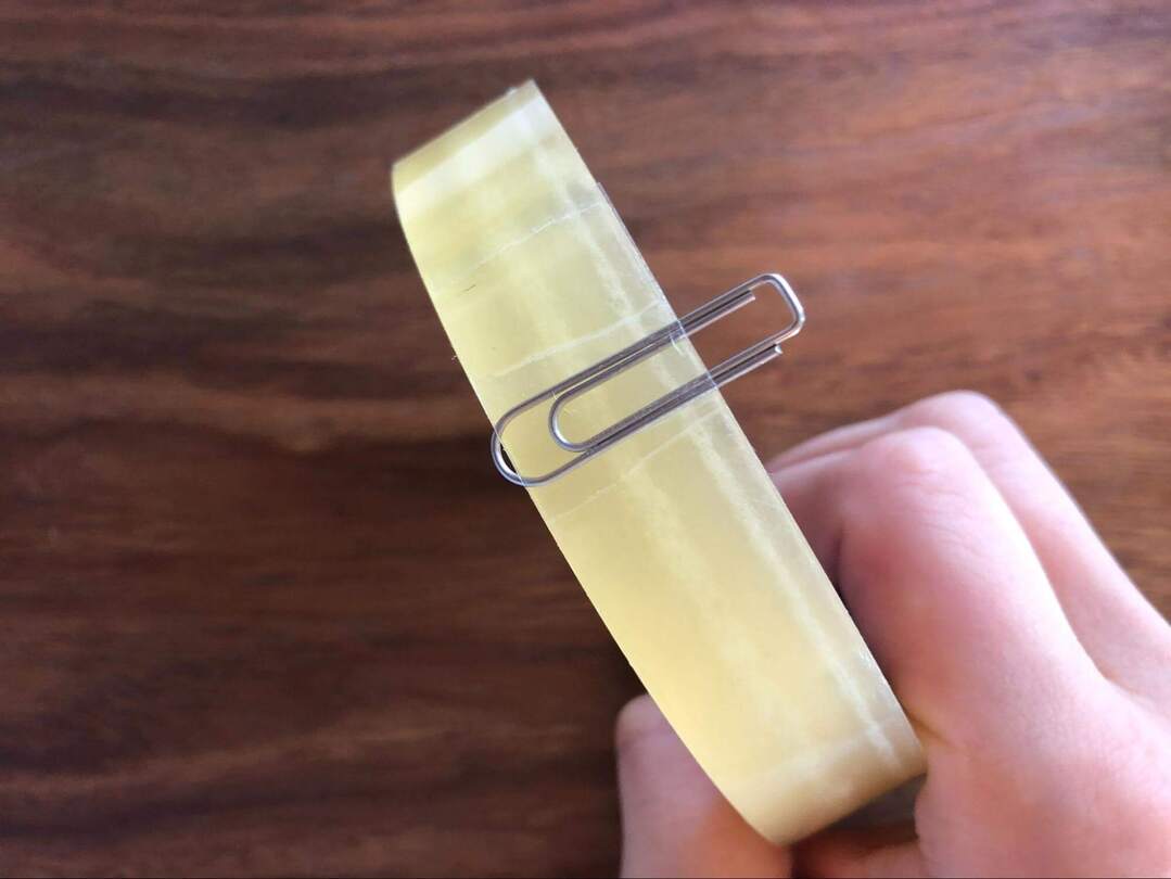 使い終わったテープ端の粘着面に、ゼムクリップを1本はさみます。このとき、ゼムクリップを少しだけはみ出させるのがポイントです。