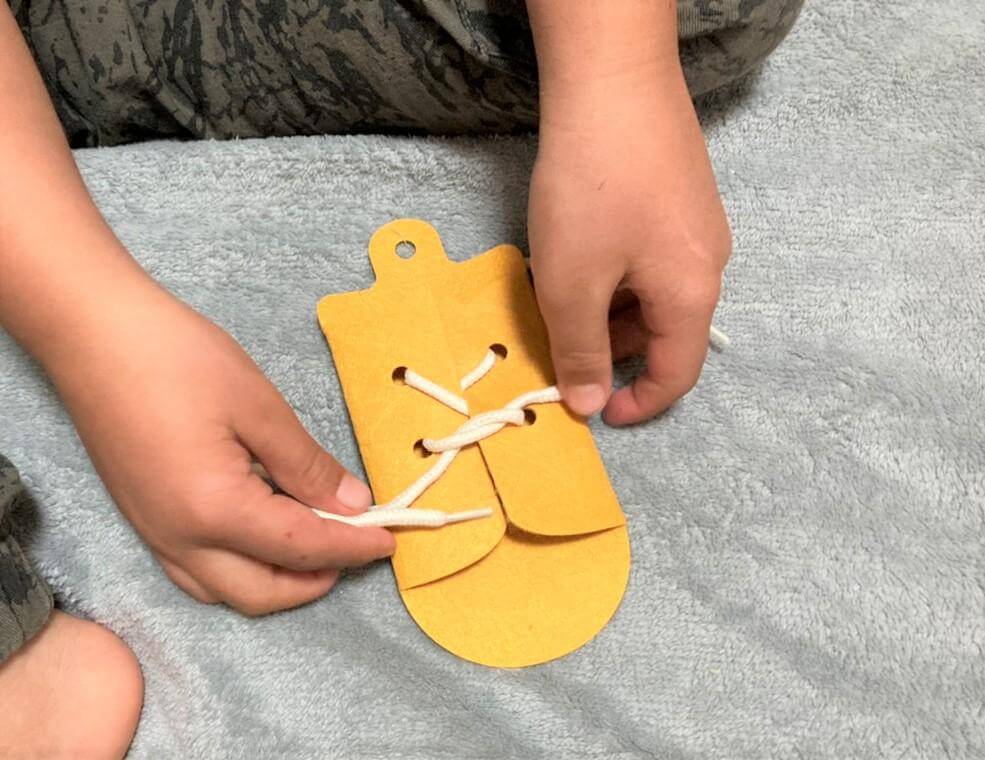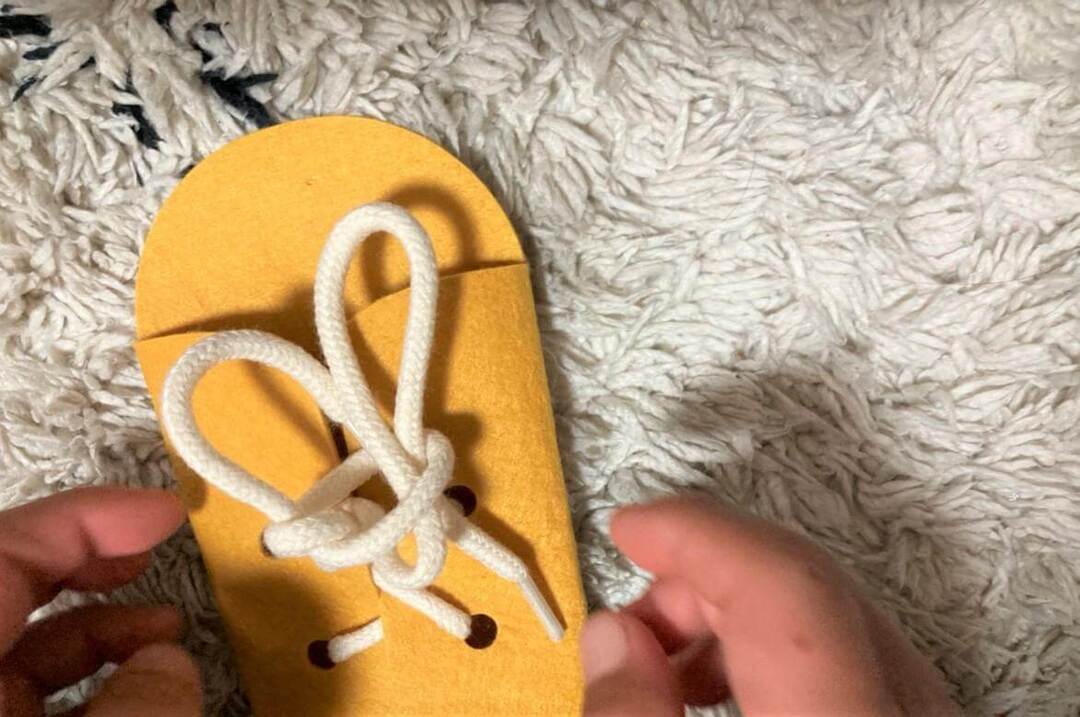 実際にくつのひもを結ぶときと同じ向きで練習ができるのもいいところ。大きさはちょうど幼児の足のサイズくらいの大きさで、練習にもってこいです!