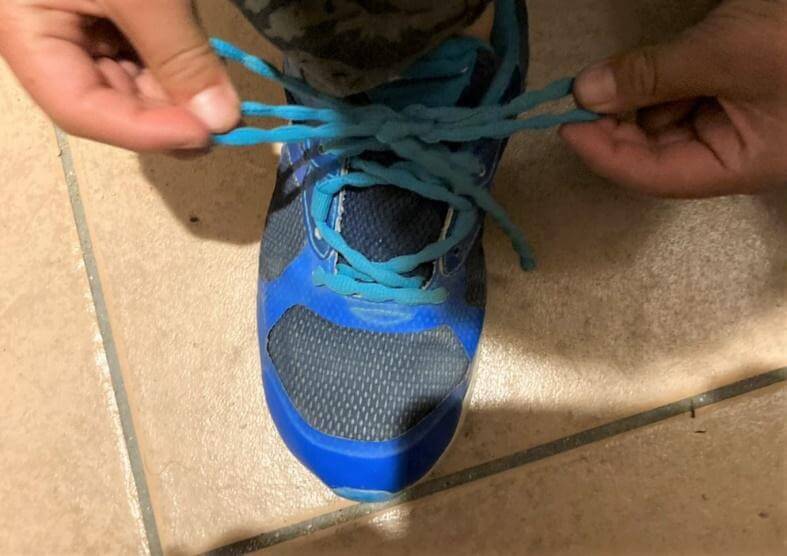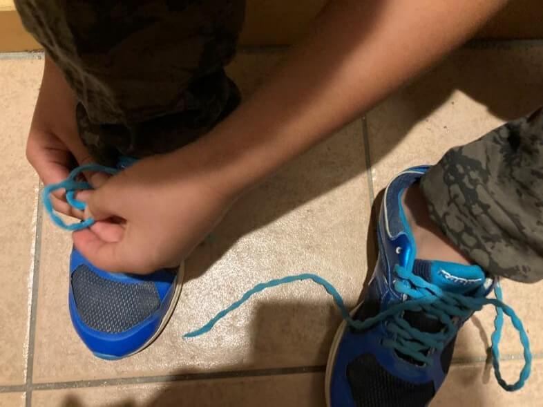 まだ完璧とは言わないまでも、「手先トレーニング くつひも」で何度か成功するようになった息子。実際にふだん履いているスニーカーでもちょうちょ結びをしてみました。