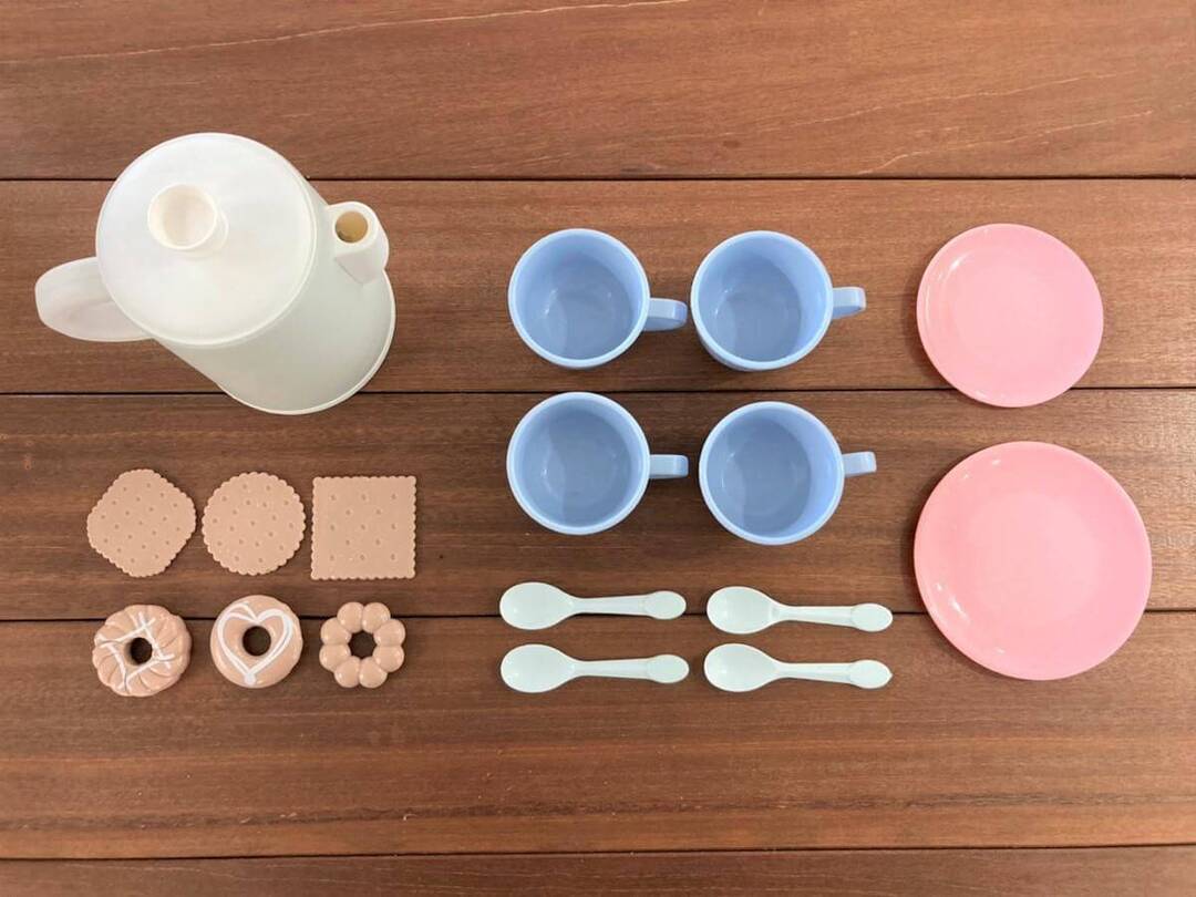 ティーポット×1・お皿大小×2・ティーカップ×4個・ティースプーン×4本・クッキー×3・ドーナツ×3と、充実の17点セット!これで550円ならむしろ安い気もしますよね。おしゃれなくすみカラーも魅力的なポイントです。