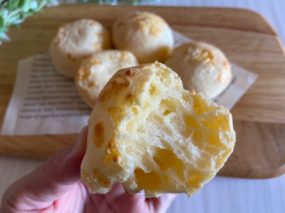 焼き上がるとチーズの濃厚な香りが!さっそく食べてみると、周りはサックリ、中はもっちり。噛みしめるたびにチーズの風味が口いっぱいに広がります。