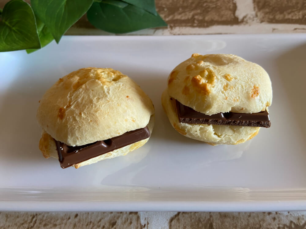 板チョコをはさんだチョコもち風もわが家では大人気。チーズの風味とチョコレート、意外に合うんです。ポンデケージョを焼いて熱いうちにチョコを挟むと熱でとろけてとってもおいしいですよ。