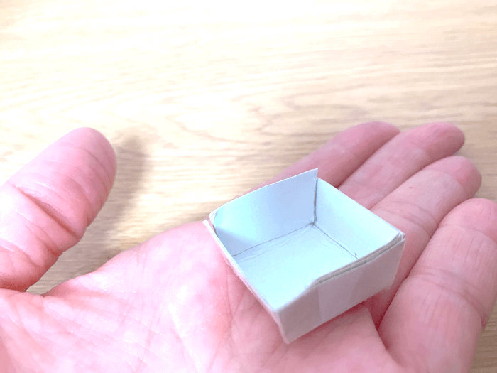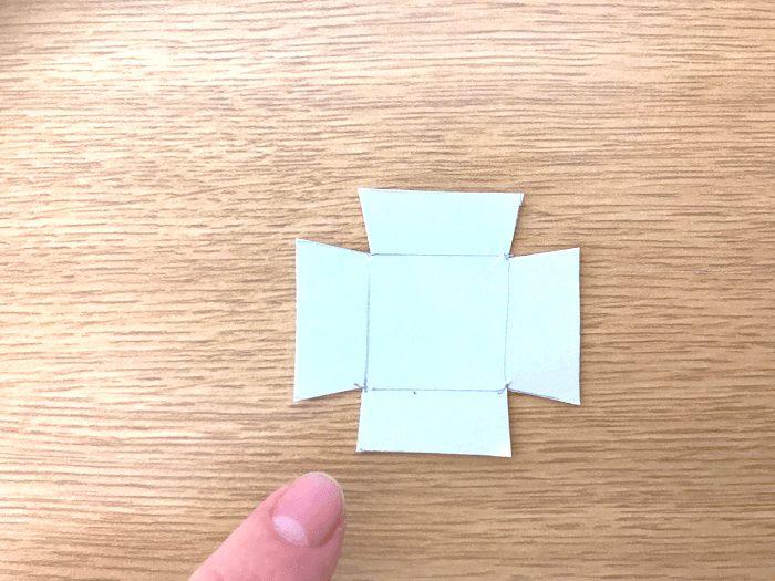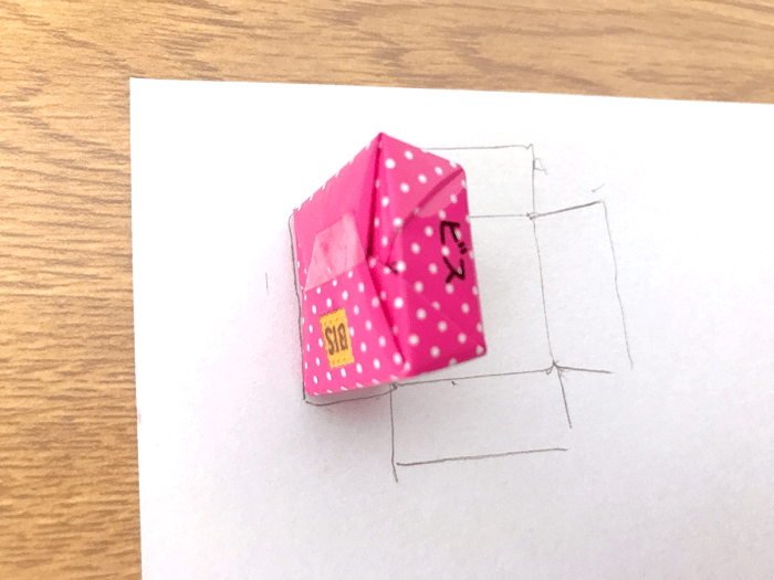 つぎにチロルチョコの形をイメージしながら線に沿って折り、四隅をセロハンテープでとめていきます。