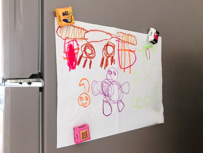 ふだんは捨ててしまうお菓子の包み紙が、ポップでかわいいマグネットに変身しました!紙粘土をいれたり、マグネットをはめる作業は子どもにお任せしてもいいかもしれません。ぜひ、おやこで作ってみてくださいね!