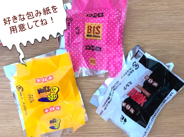 チロルチョコの包み紙は好きなものを用意してください。銀紙も使うので、捨てずにとっておいてくださいね!チロルチョコ含め、材料・道具はすべて100均で揃えることができますよ♪