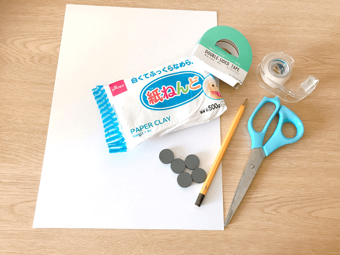 厚紙、紙粘土、小さめのマグネットを用意しましょう。厚紙がない場合はお菓子やティッシュなどの空き箱を使ってもOK!