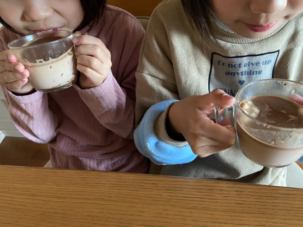 飲むまでの工程がとにかく楽しい!子どもたちと一緒に初めて作った時は、まあるいチョコレートがこのあとどうなるのか、目の前で何が起こるのか興味津々でとっても楽しんでいました。