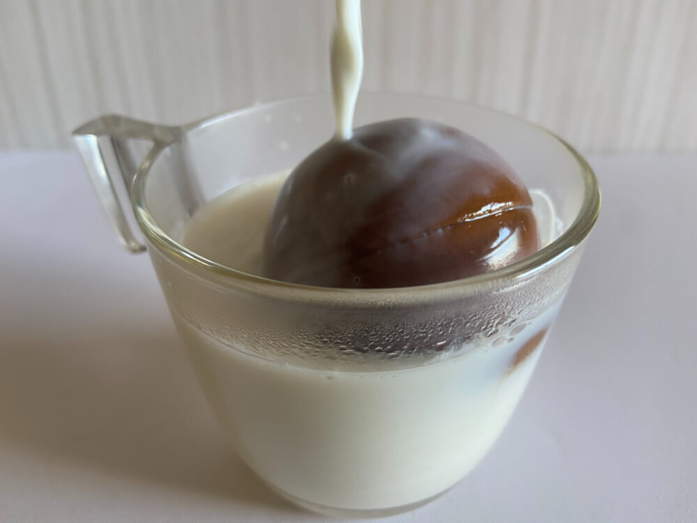 電子レンジで温めた牛乳だとチョコレートがきれいに溶けなかったので、少し手間ですが小鍋で牛乳を熱々に温めてからかけるのがうまく溶けるコツだと感じました。