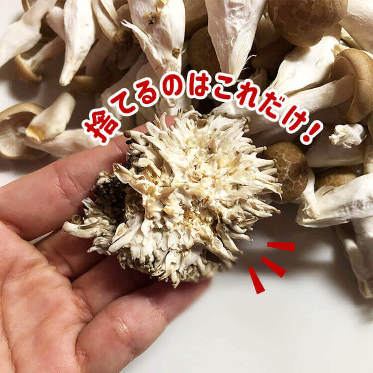 ぶなしめじをひっくり返し、指で軸の中央部分をもって端から順にやさしく引き抜くだけ!下向きにひねるようにして引っ張るときれいに「スポッ!」と抜けますよ。