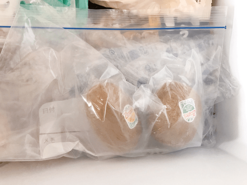 今回検証した"皮を手でつるっとむく方法"は冷凍キウイを使います。まずはキウイを凍らせましょう。用意した2種類のキウイをラップに包み、保存袋に入れて冷凍庫へ!準備はたったこれだけなので、簡単ですね。