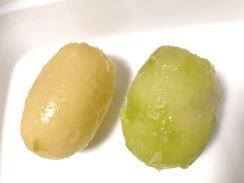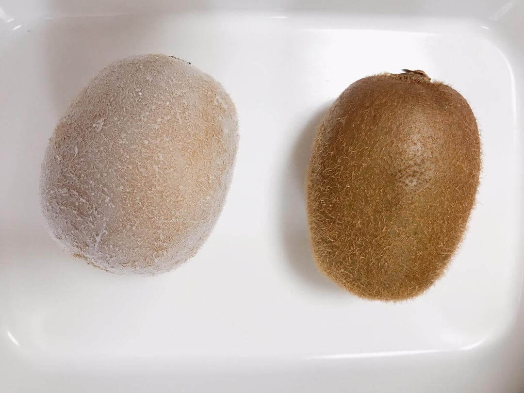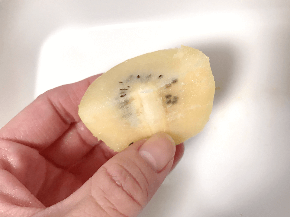 写真左が丸1日冷凍したキウイ。中までカチカチに凍っています。