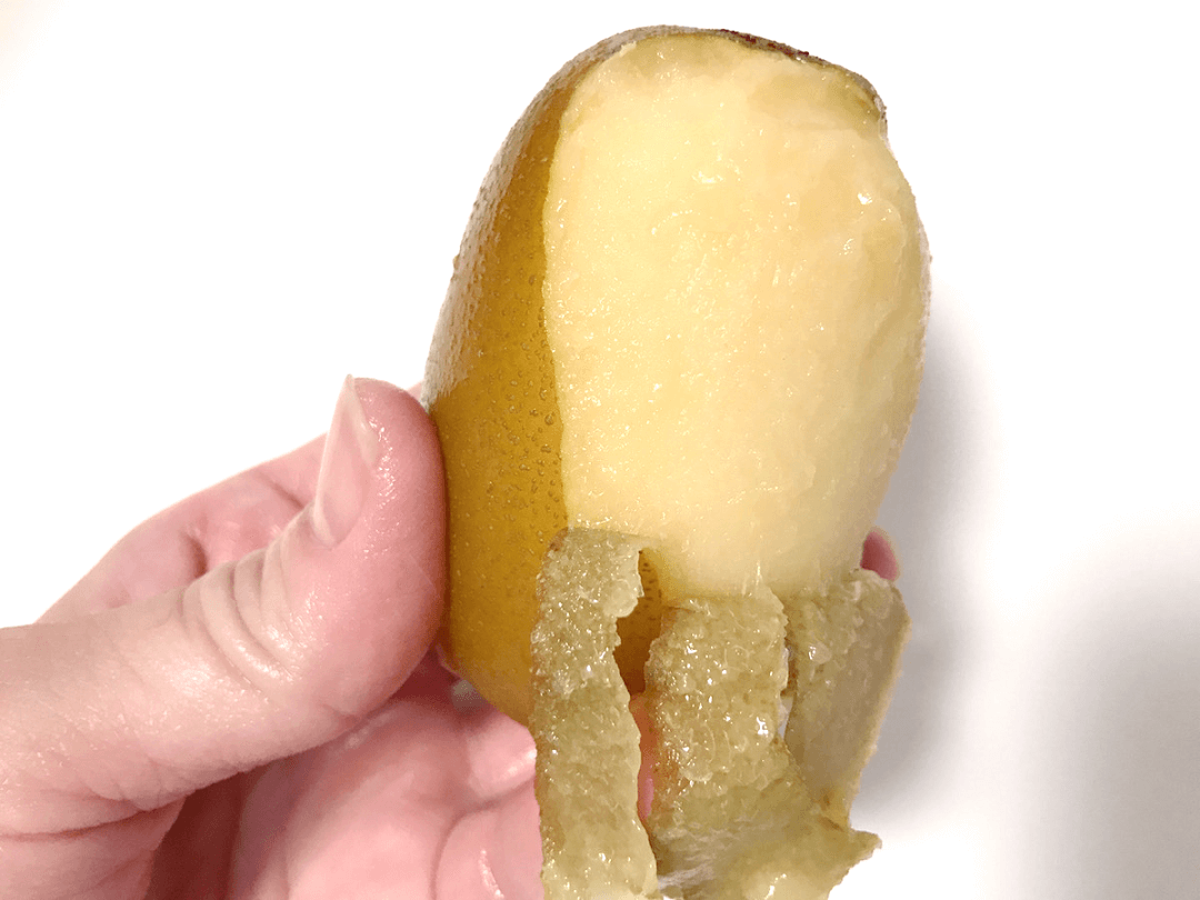 流水にさらしたら、皮をめくっていきます。慎重に皮を引っぱっていくと…。おもしろいほどつるっとむけました!