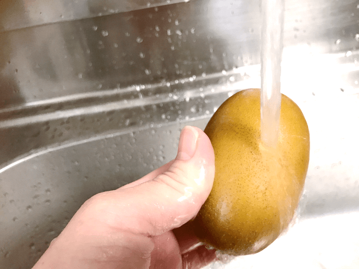 流水に10秒~30秒ほどあて、皮の部分のみ解凍させます。爪を引っかけて少し引っぱり、皮がむけそうな状態になっているか様子を見ながら水をかけるといいですよ。