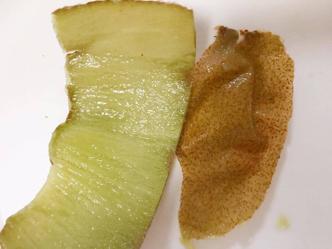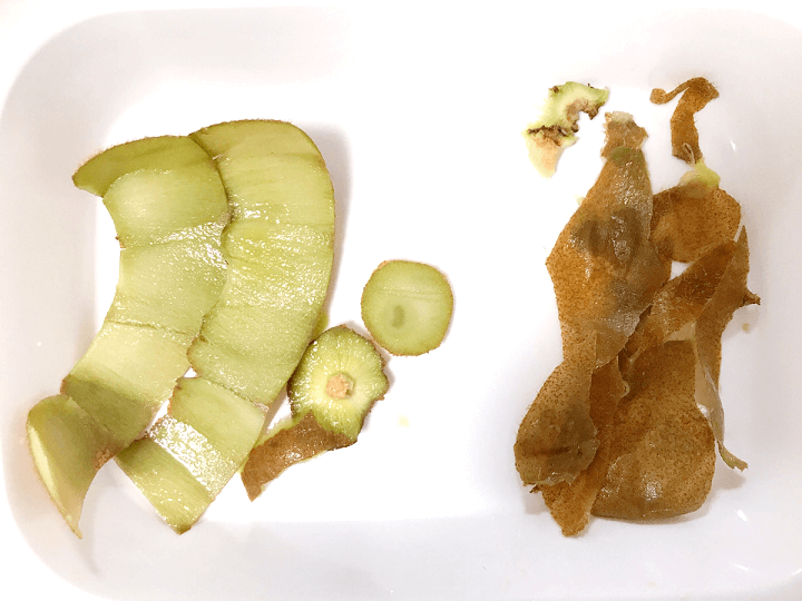 皮についている果肉の量の違いは、一目瞭然です!冷凍したキウイのほうは、ほぼ皮だけですね。手軽に皮むきができるだけでなく、食材をムダなくいただけるのもメリットです。