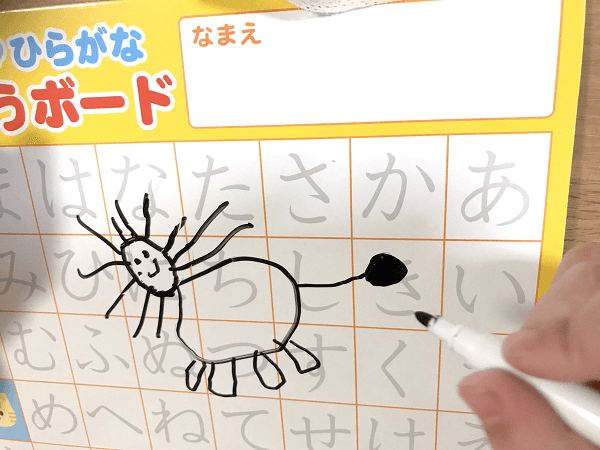 練習の合間にちょっと休憩!ライオンを描いていました。すぐに消せるので「文字の練習に飽きちゃった」というときに気分転換をしてみてもいいでしょう。