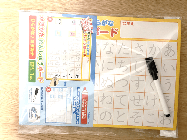 セリアの「かきかたれんしゅうボード」は、両面を使ってひらがな・カタカナを書く練習ができます。専用マーカーまでついて110円(税込)とはコスパもいいですね◎