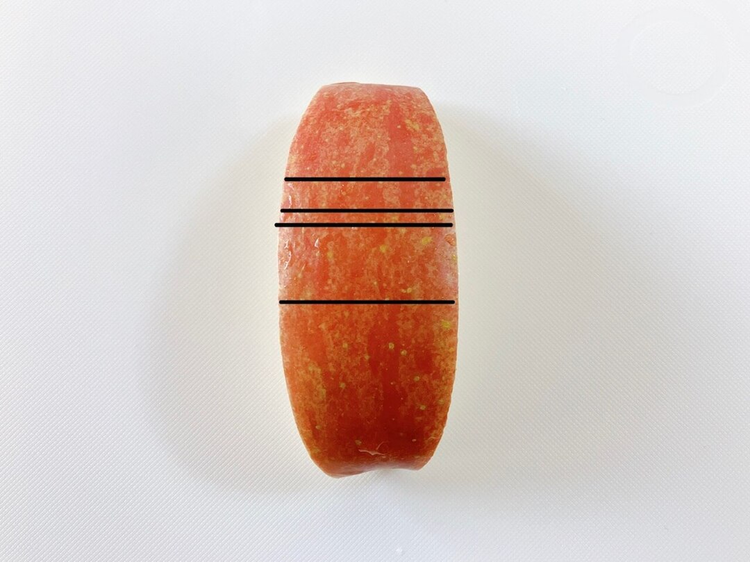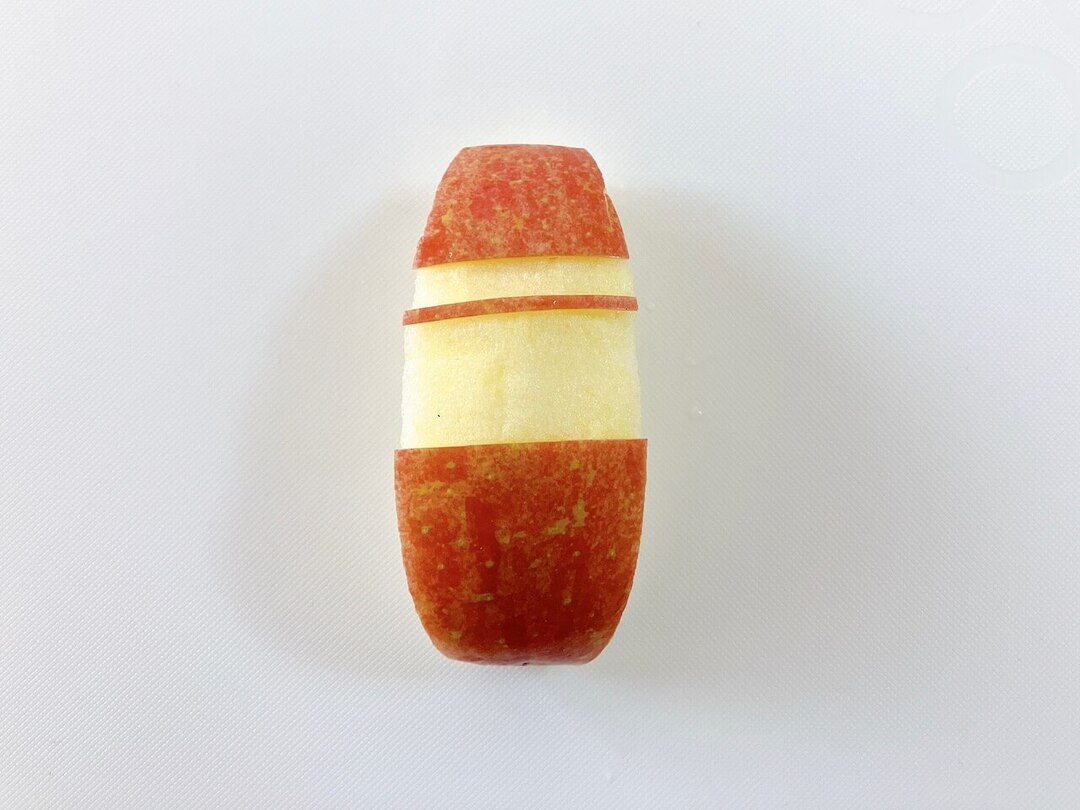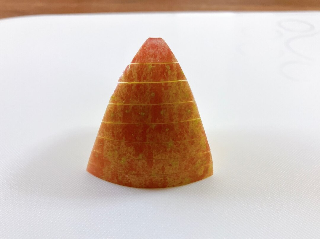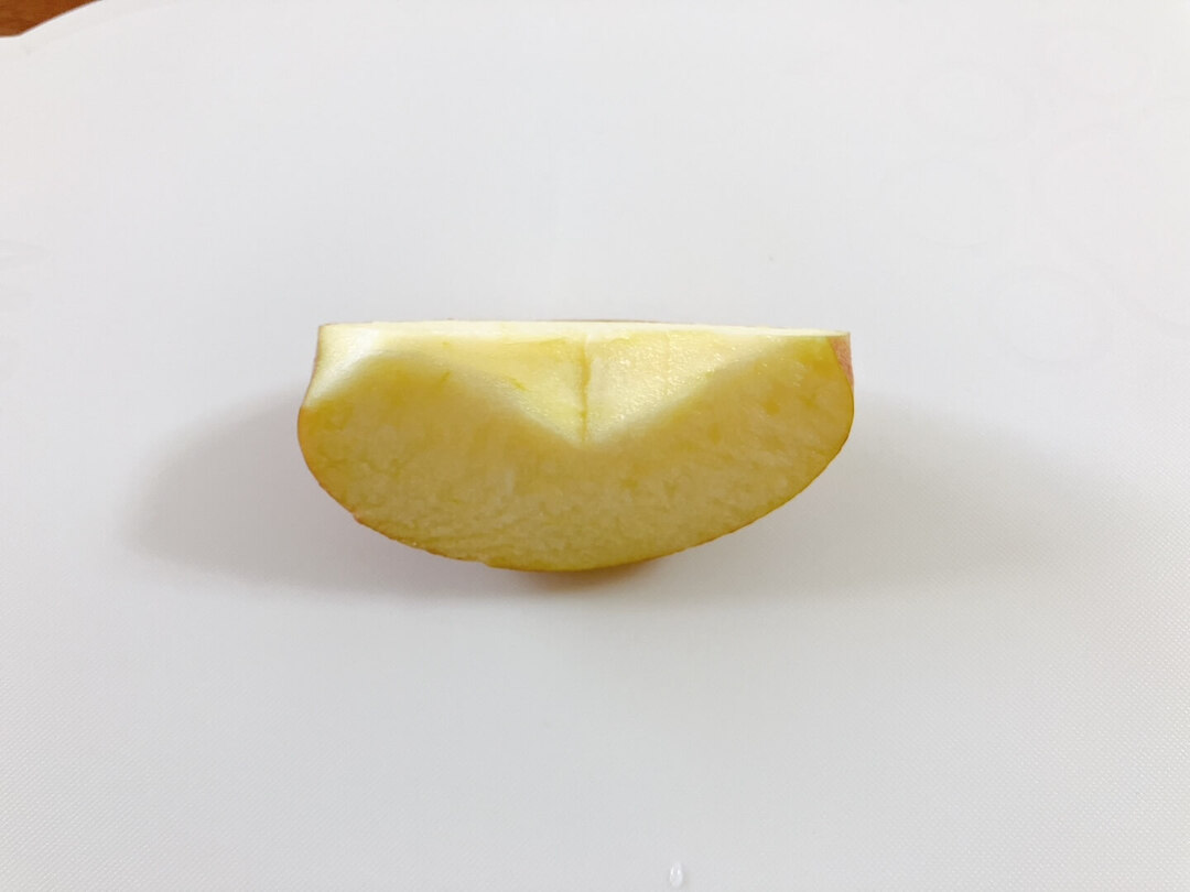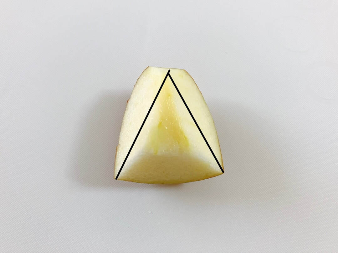 りんごを8等分のくし型切りにして、芯を切り落とします。