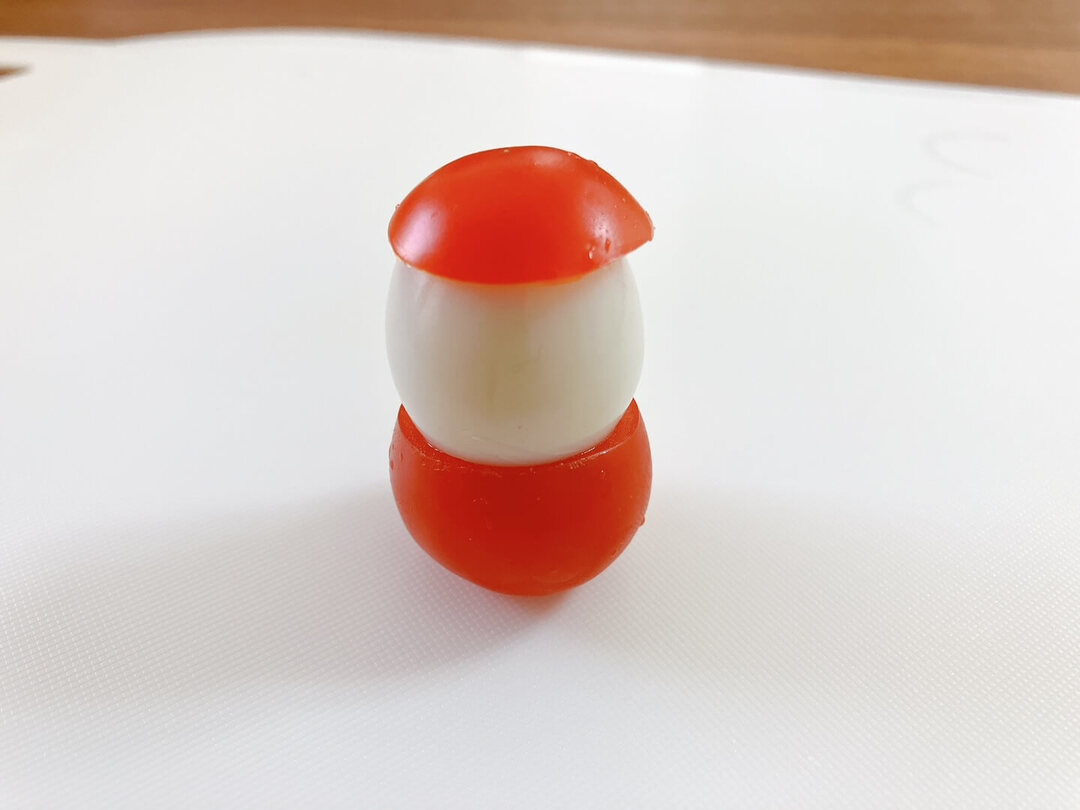 ミニトマトでうずらをはさみます。不安定な場合はピックで刺して立たせてもOKです。