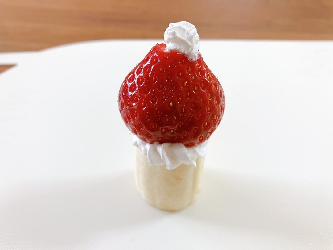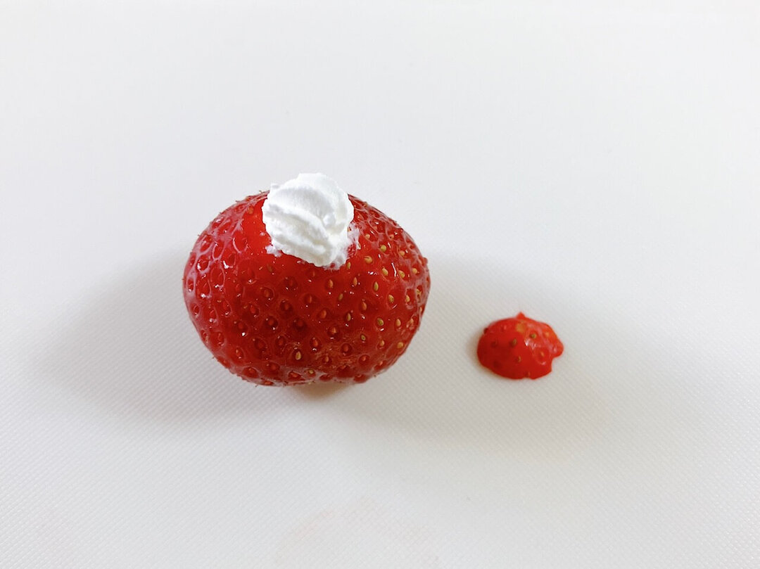 いちごは先端をごくわずかに切り落とし、生クリームを少量絞って帽子のポンポンに見立てます。切り落とした先端は鼻にするので取っておきます。