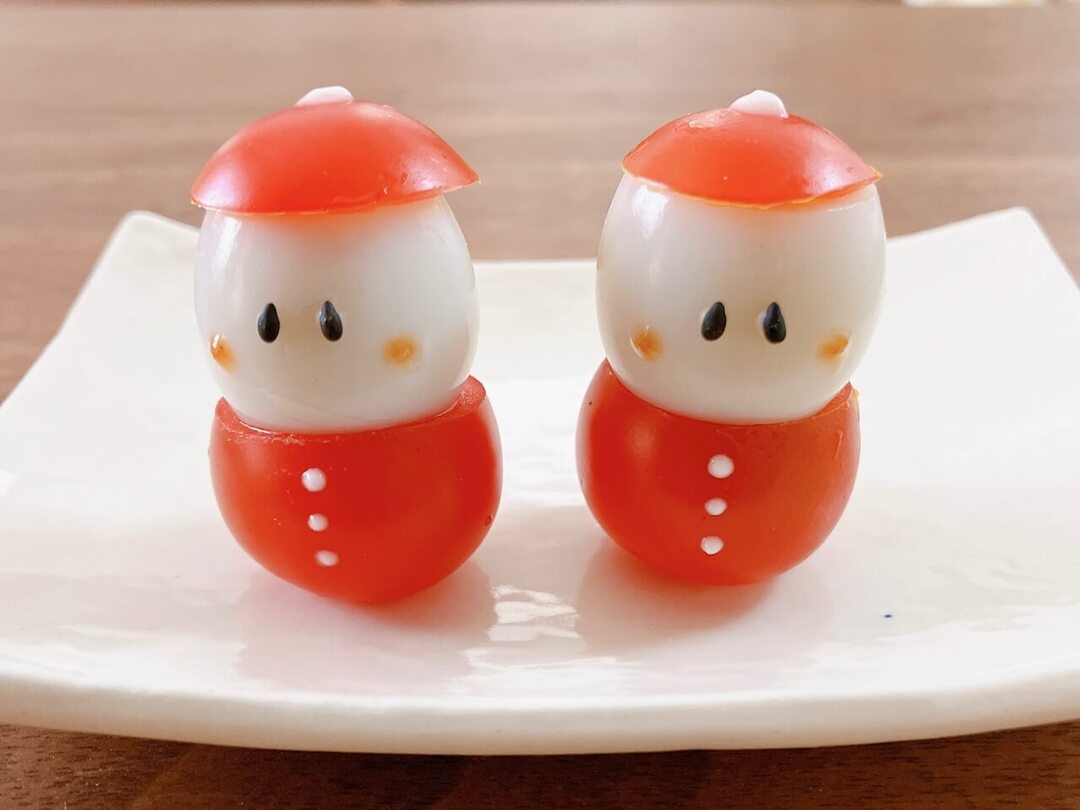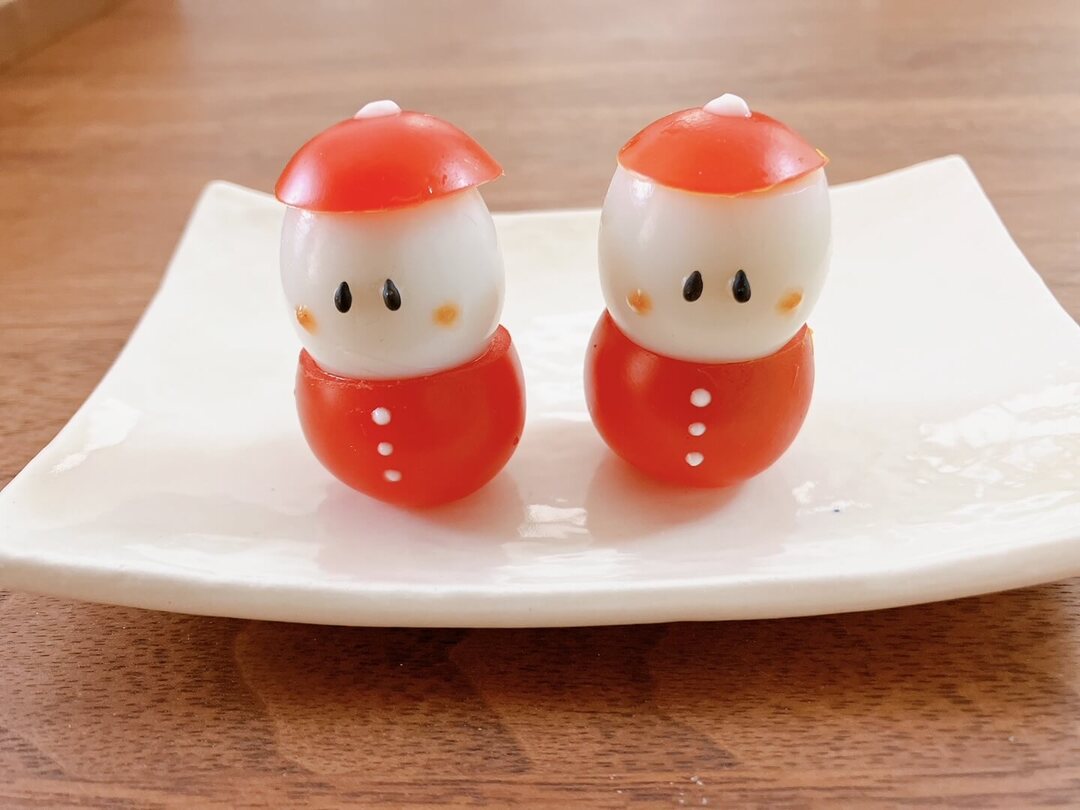 クリスマスのデコをするのに便利な赤いミニトマト。ちょうど同じくらいのサイズのうずらの卵を使ってかわいいミニサンタを作ります。