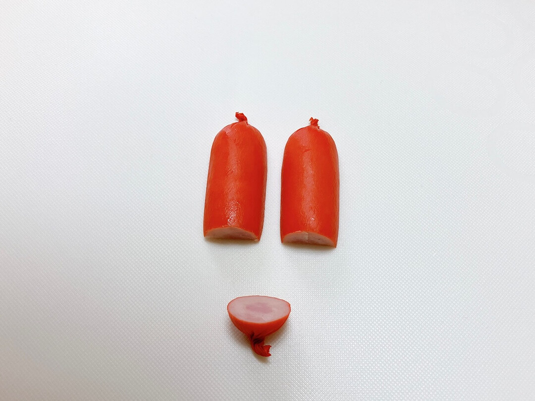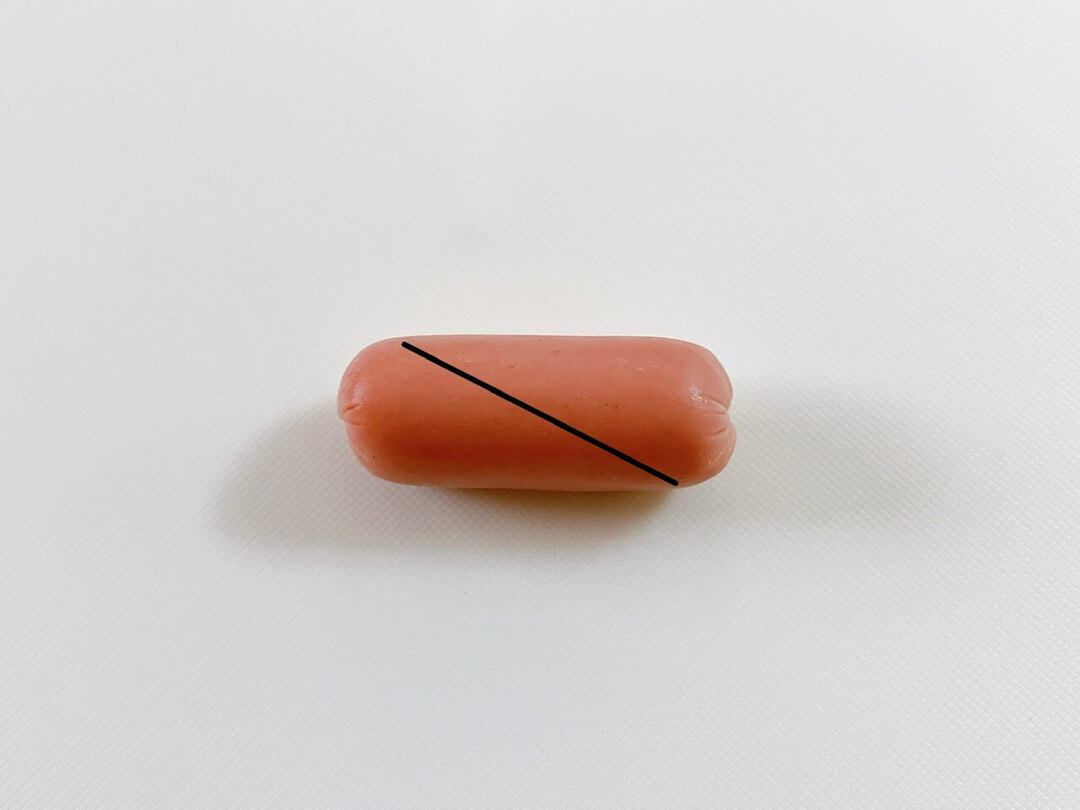 まず写真のように斜め半分に切ります。1個のウインナーでトナカイの顔が2つ作れます。