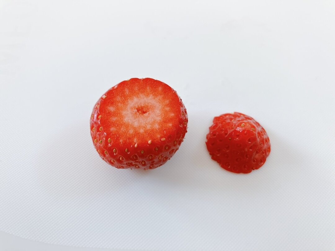 いちごの先端から1/3くらいのところを切り、ヘタ側を下にして立てます。まっすぐ立たない場合は、ヘタ側を少し切っても。
