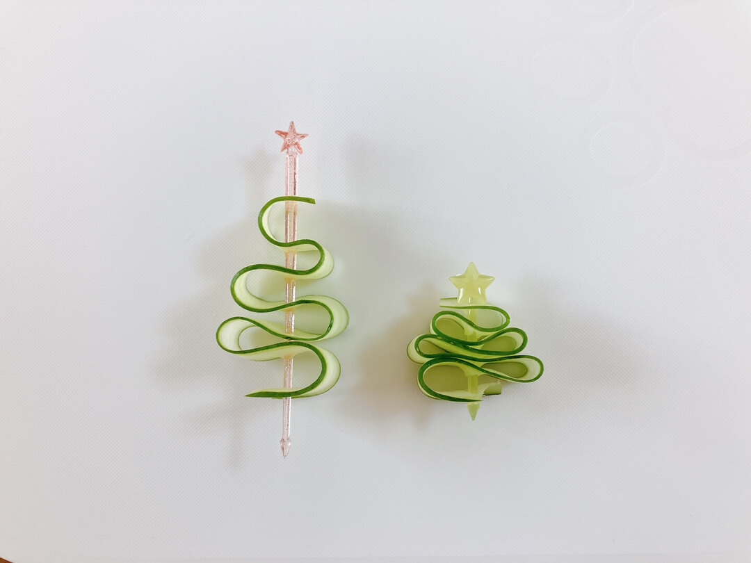 同じ1枚のリボン状のきゅうりでも、ピックの長さでツリーの雰囲気が変わりますね。使ったのは100円ショップで購入した星のピックです。