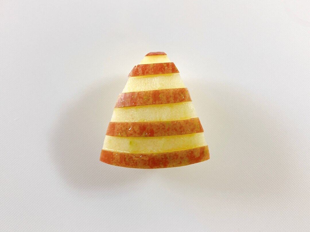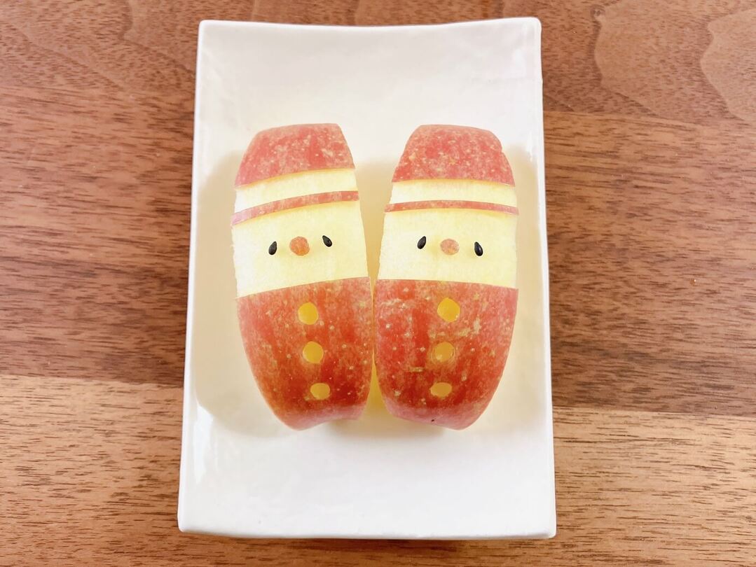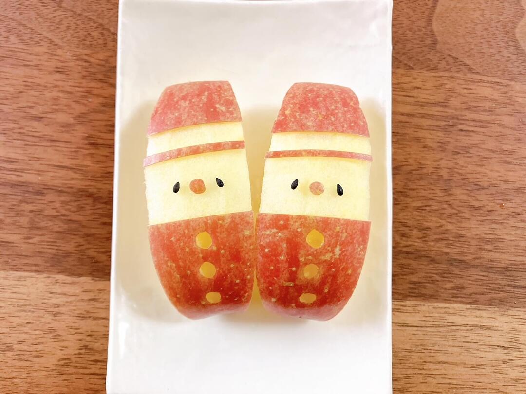 くし形切りのりんごが、皮のむき方でたちまちサンタに!とっておきの日におすすめの飾り切りです。