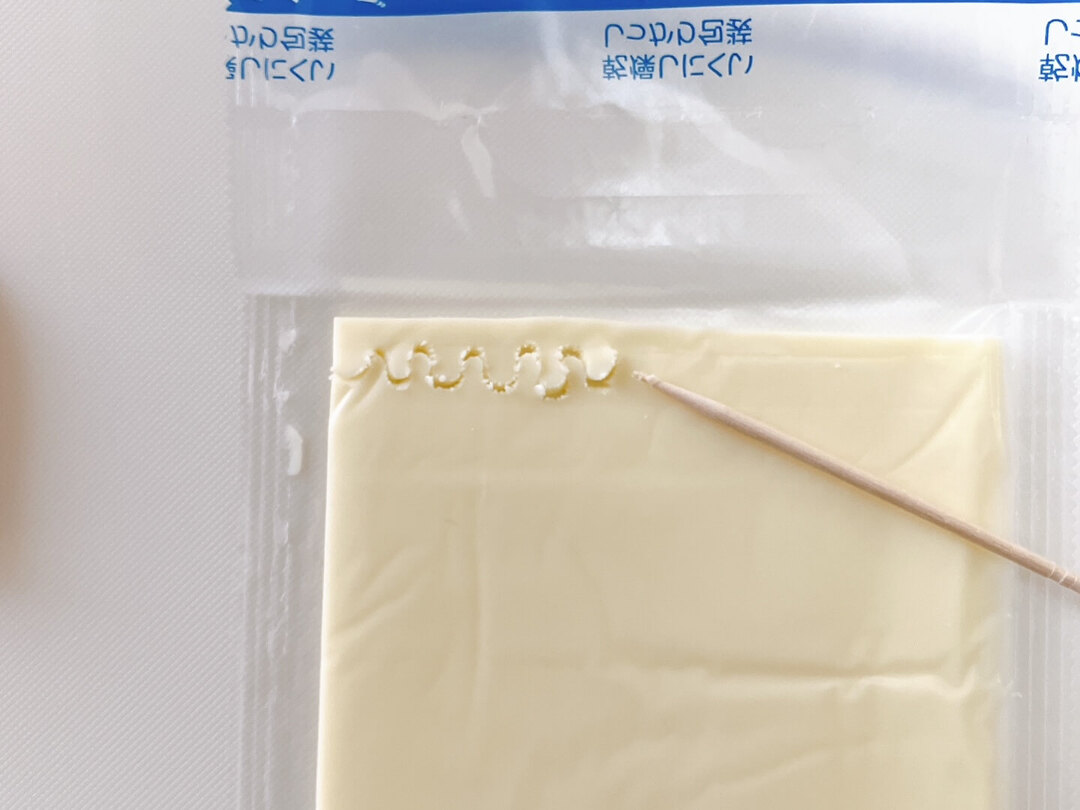 スライスチーズを爪楊枝を使って波状に切ります。これが溶けた"ろう"の部分になります。同じようにろうそくの炎になるしずくの形に切ります。